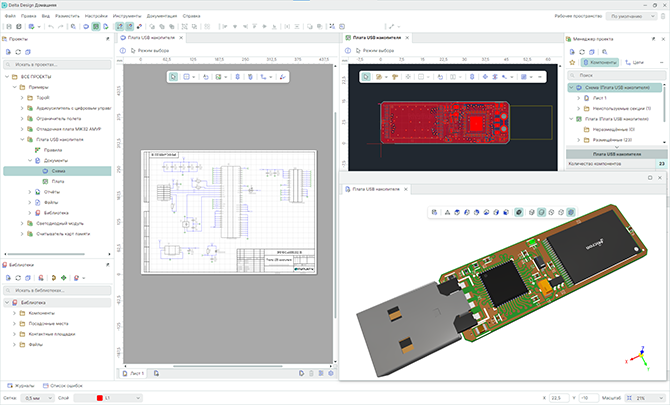 Delta Design Домашняя - Версия для проектирования электроники, оптимизированная для индивидуальных применений и малых команд вне корпоративной среды. В составе ПО есть инструментарий для работы с библиотеками компонентов, схемотехнический редактор, редактор плат до 4 слоев, функционал DRC-проверок и вывод файлов для производства в формате Gerber.
